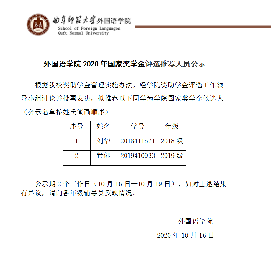 伟德国际BETVlCTOR2020年国家奖学金评选推荐人员公示