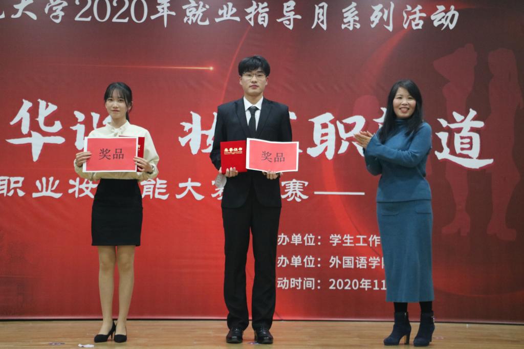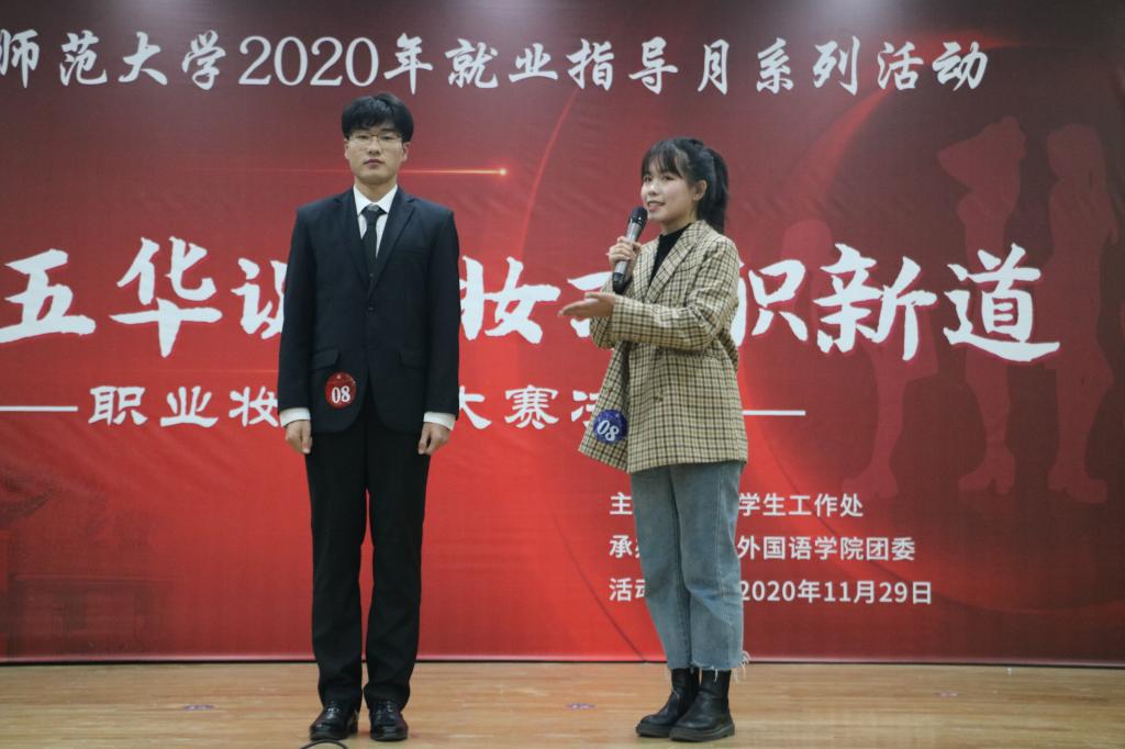经过初赛、复赛的激烈角逐,共有7个学院的11组选手进入决赛。比赛过程中,各组选手在模特展示和模拟面试两个环节均展现出大方得体的妆容形象、沉着冷静的心理素质和较强的随机应变能力。其中,伟德国际BETVlCTOR选手王德龙以符合专业特色的职业定位和精彩的现场表现,给观众们留下了深刻印象;教育学院选手张睿迪妆容清爽,身着职业套裙,尽显大方干练,模拟空姐职业,赢得了评委们的好评。最终,王德龙、王智毅两组选手获得一等奖,程佳雨、张睿迪等三组选手获得二等奖,李雅文、于淑萍等六组选手获得三等奖。